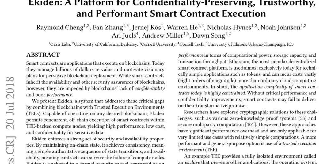 在我看来,隐私性正成为推动区块链下一波浪潮的关键因素。您在今年4月份发表的论文《Ekiden:APlatformforConfidentiality-Preserving,Trustworthy,andPerformantSmartContractExecution》中,对Ekiden在保护隐私方面的技术架构进行了重点阐述。