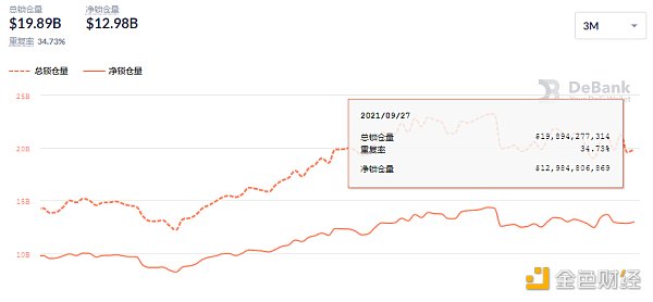 Ethereum链上DeFi锁定资产前十排名及锁仓量,数据来源:Debank