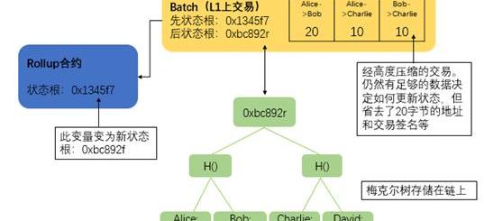 具体而言,Rollup将交易数据进行压缩编制成梅克尔树,并存储在链上;同时在智能合约中保存梅克尔树的树根。Rollup的运营方可以将发布一批汇总交易,该交易即压缩过的交易集合,而且包含之前的状态根和新状态根(处理交易之后的新梅克尔树根)。智能合约会对状态根进行检查并更新,由此实现资产的转移。