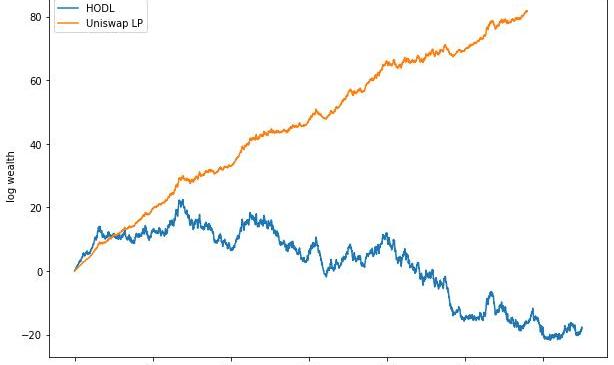 如果一项资产的波动性相对于其平均回报率足够高,那么随着时间的推移,Uniswap上的LP将比囤币者的表现更好,即使是在所有交易都是套利交易的情况下。