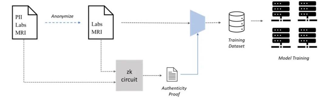 Web3可以帮助AI的一个领域是通过协作创建专有数据集进行机器学习训练,即使用PoPW网络进行数据集创建。大规模数据集对于准确的ML模型至关重要,但在需要使用私有数据的用例中,其创建可能成为瓶颈。由于患者数据隐私的关注,医疗记录的访问是训练这些模型的必要条件,但患者可能因隐私问题而不愿意分享他们的医疗记录。为了解决这个问题,患者可以通过可验证的方式对其医疗记录进行匿名化,以保护他们的隐私同时仍然可以用于ML训练。但是,匿名化的医疗记录的真实性是一个问题,因为虚假数据会严重影响模型的性能。为解决这个问题,可以使用零知识证明来验证匿名化的医疗记录的真实性。患者可以生成ZKPs,以证明匿名记录确实是原始记录的副本,即使在删除个人身份信息后也是如此。这样,患者可以将匿名记录与ZKPs一起提供给感兴趣的各方,并甚至获得他们的贡献的奖励,而不会牺牲他们的隐私。