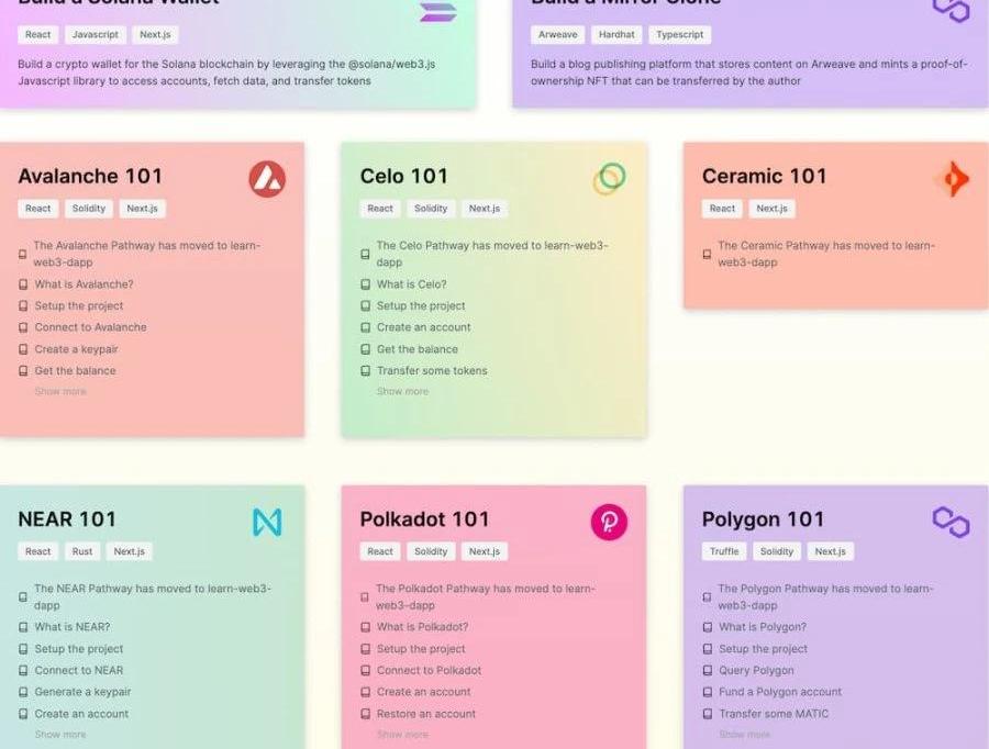 Questbook是一个为Web3构建者提供的捐助和赏金的工具,也发布了一个去中心化的学院,帮助开发者学习在Web3中编码,涵盖以太坊、Solana、NEAR以及Polygon上的免费编码知识,完成任务后还可获得NFT奖励。
