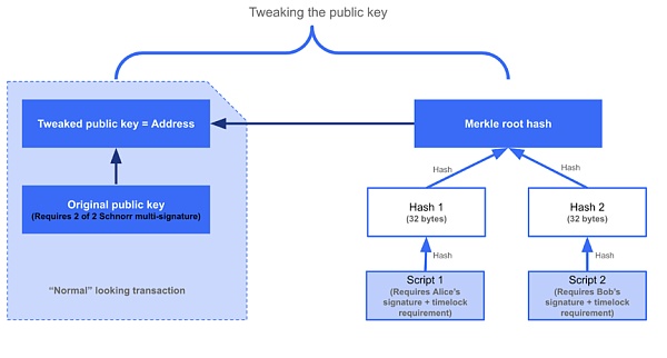 Taproot可以看作MAST(Merkelized Abstract Syntax Tree,默克抽象语言树)的一种应用,Taproot在与MAST类似的前提下运作,将交易支出条件划分为默克尔树哈希。但与原有的比特币脚本逻辑相比,Taproot 结构仅显示一个由支出条件的默克尔根和原始公钥的组合生成的经过调整的公钥。