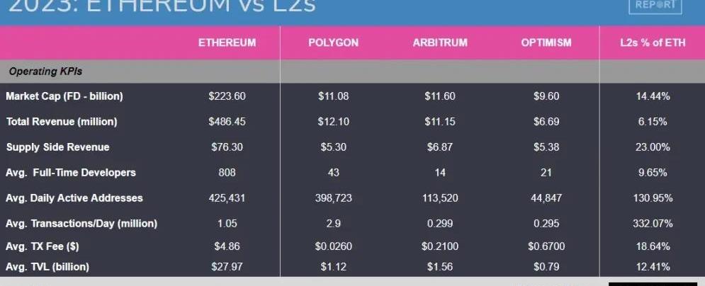 数据来源:ArcanaAnalyticsArbitrum和Optimism现在占用的区块空间比Polygon多。总体而言,这三个L2占当前以太坊区块空间的4.5%左右,高于2022年底的约3%。接下来看一下L2中的其他数据: