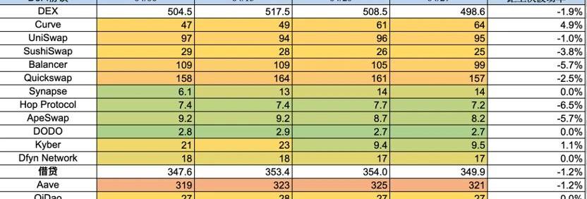 本周TVL出现1.6B的下跌,下降幅度为2%。本周ETH链占比同样下降,从上周的59.33%下降到58.8%,降幅~0.5%,但近几个月的大趋势看eth生态的TVL在稳定上升。从近七日的数据看,在以太坊二层网络的核心公链中,Optimism本周下跌为1.9%,Arbitrum上涨1.65%,Polygon下跌1%,Avalanche下跌2.87%。三、各链协议锁仓量情况