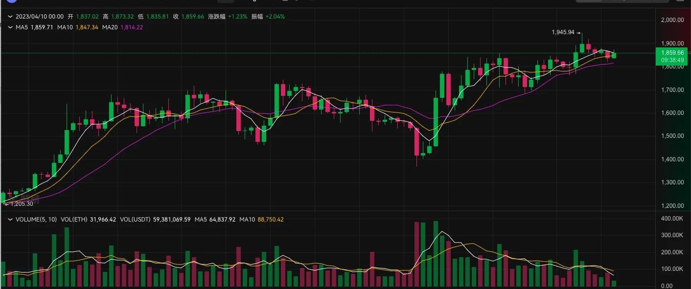 1.现货市场OKX行情数据显示,上周ETH价格一度上涨逼近1950美元,周内收于1836美元,环比上涨2.1%。