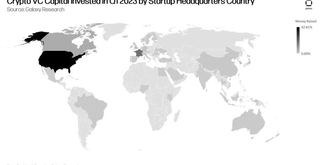 总部位于美国的加密初创公司完成了最多的融资。2023年第一季度,总部位于美国的公司筹集了所有VC投资总额的42.8%,其次是法国(19.4%)、加拿大(6.6%)和瑞士(4.1%)。