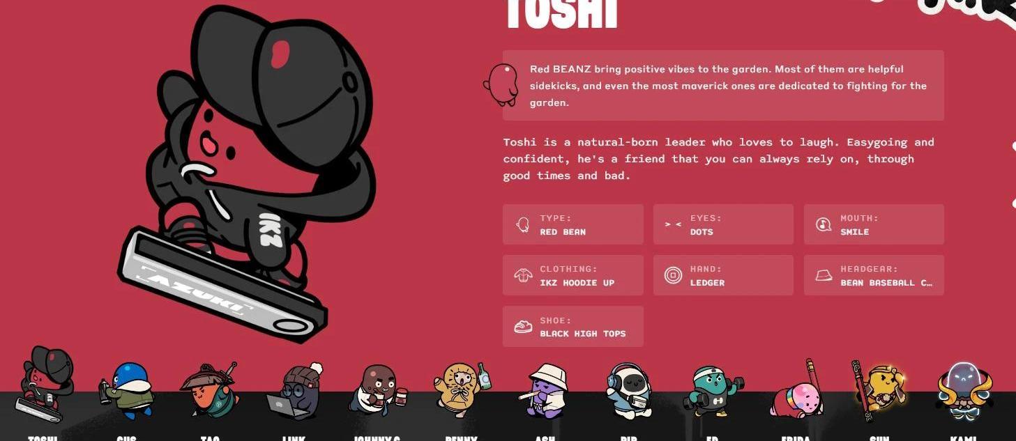 LineFriendsIPBeanzNFT被译为“小豆子”,2022年4月由ChiruLabs推出,Beanz是一种从花园的泥土中发芽的小物种,被赋予了“Azuki的伙伴”人设,用他们的滑稽动作为Azukis增添趣味。BeanzNFT代表成员有红豆Toshi、和蓝豆Gus、黑豆Link、小扁豆Tao、咖啡豆JohnyC等,每个小豆子从服装、头饰、鞋子、手部道具等装扮形象各有不同。该系列发行总量为2万个,其中1万个空投给AzukiNFT的持有人。