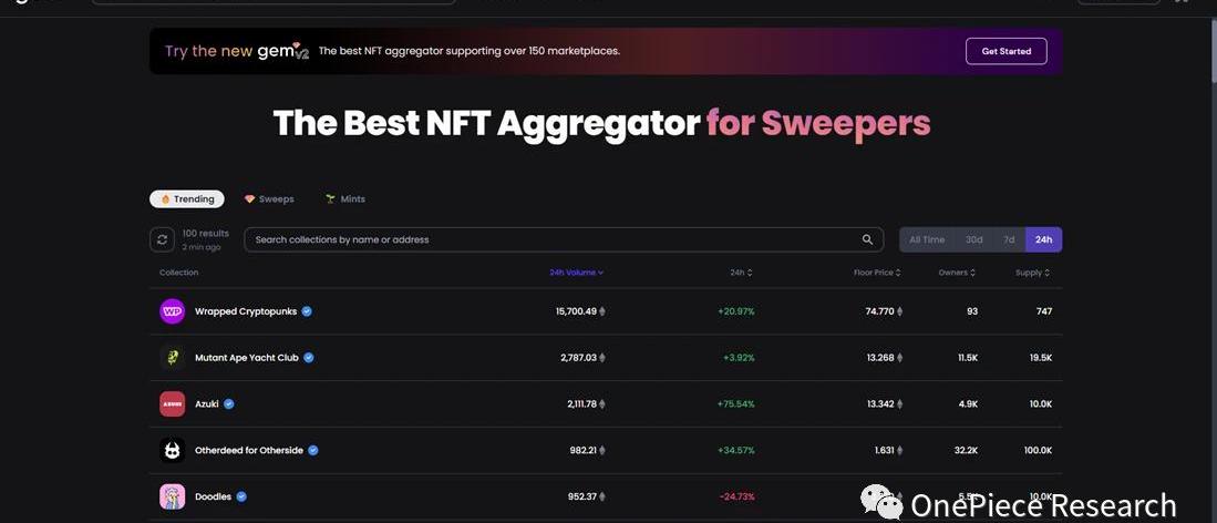 Gem是?个NFT聚合器项?,是在Blur上线之前最?的聚合器。它提供了?个平台,让??可以轻松发现和购买不同NFT市场和平台上的NFT。类似于Blur,Gem聚合了多个主流NFT市场的流量,并以较低的成本实现批量购买NFT。这可以帮助??在不同的Marketplace上获得最好的交易,同时也为Gem本?带来更多的流量和收益。Gem具有导流作?,可以将??从不同的NFT市场和平台引导到??的平台上,这可能会形成?定的流量劫持效应,使Gem成为?个聚合?量NFT流量的中?。在2022年4?,Gem被Opensea收购,但保持独?运营。这意味着Gem将成为Opensea的?部分,并受到Opensea的?持和资源,但仍将继续提供其独特的功能和服务,以满?不同??的需求。作为Opensea的?部分,Gem可以更好地服务于Opensea的??,并扩?其影响?和市场份额。Genie是最早的NFT聚合器项?,与Gem具有相似的功能和定位。与Gem相?,Genie聚合的NFT市场和平台数量较少,但仍然能够为??提供?个?便的平台,让他们可以轻松发现和购买不同NFT市场和平台上的NFT。在2022年6?,Genie被Uniswap收购,成为Uniswap的?部分。Uniswap是?个基于以太坊区块链的去中?化交易所,通过智能合约实现资产交换和流动性提供。收购Genie可以帮助Uniswap扩展其服务范围,并为??提供更多NFT相关的?具和服务。这意味着Uniswap可以利?其在去中?化交易领域的领先地位,吸引更多??并为其提供更多NFT服务。同时,使?Genie作为?具,Uniswap可以提供更好的NFT浏览和购买体验。此外,与新兴的NFT市场合作可以帮助Uniswap扩?其??基础并增加收?来源。整体来说,Gem的Genie的功能较为单?,可替代性强。此外,两个平台都未发?代币,从??法利?代币驱动业务的持续发展。然?,在收购后,Gem和Genie都可以借助其?公司的?持和资源来扩展其服务范围,并为??提供更多的功能和服务。这将有助于它们在竞争激烈的NFT聚合器市场中保持竞争?并实现?期发展。
