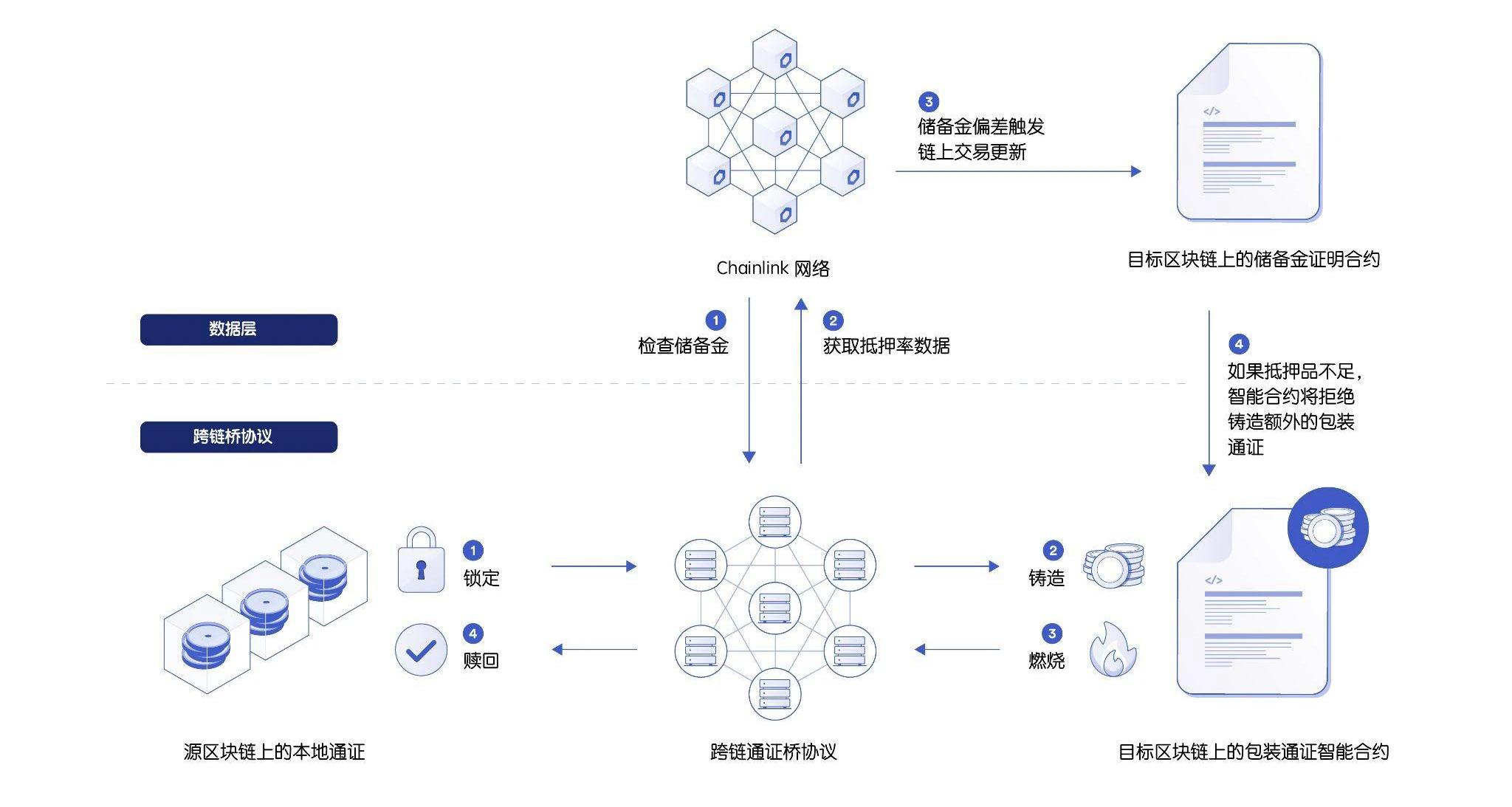 Chainlink储备金证明(PoR)为智能合约提供了所需的信息,用以计算支持包装通证的任何跨链储备金的真实抵押率。Chainlink储备金证明(PoR)由去中心化的预言机网络运作,验证跨链抵押品——即充当包装通证桥的数据层。
