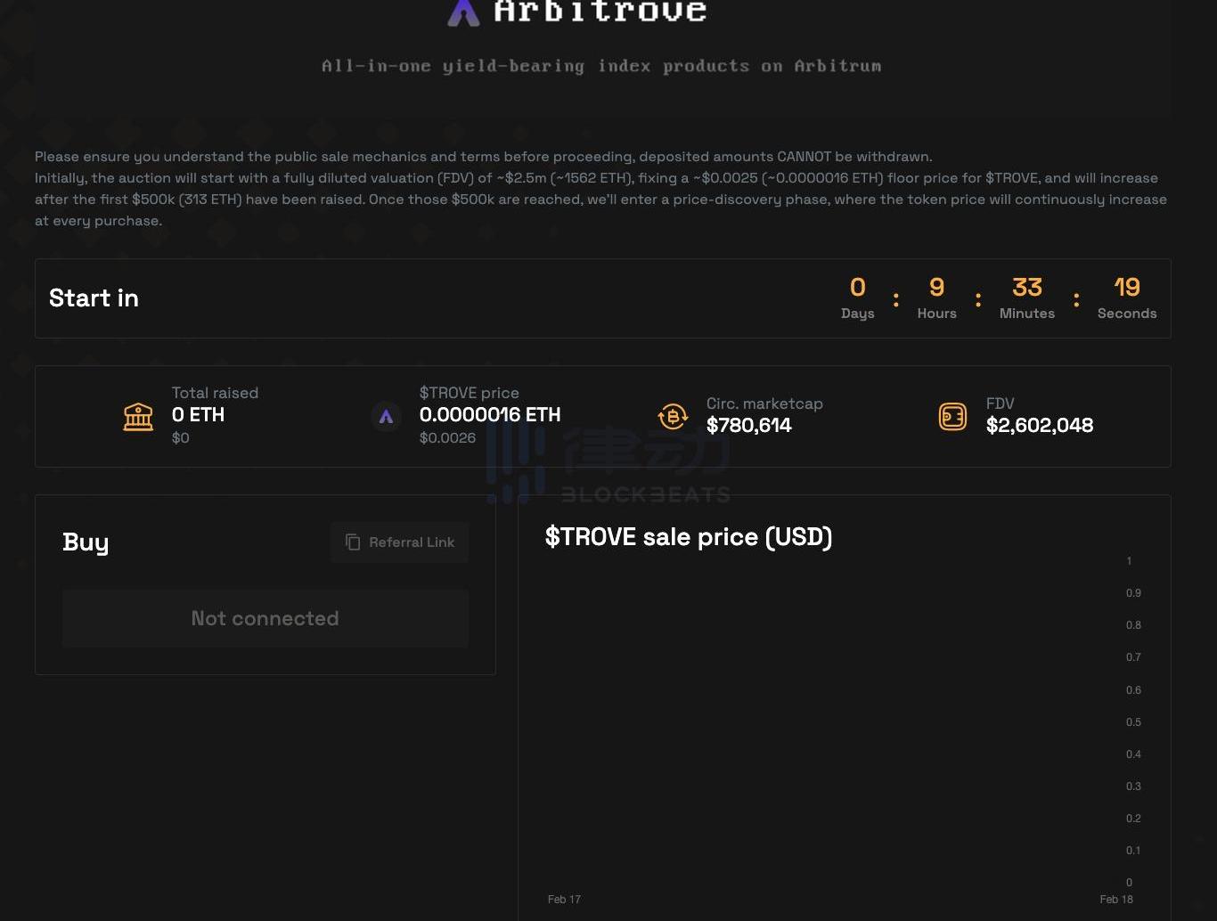 团队以约250万美元的FDV为TROVE固定0.0025美元的底价。在PublicSale资金达到50万美元或约313ETH后,TROVE价格将随每次购买不断上涨。在PublicSale页面下方有推荐链接,通过该链接引导参与者加入可获得3%的奖励。
