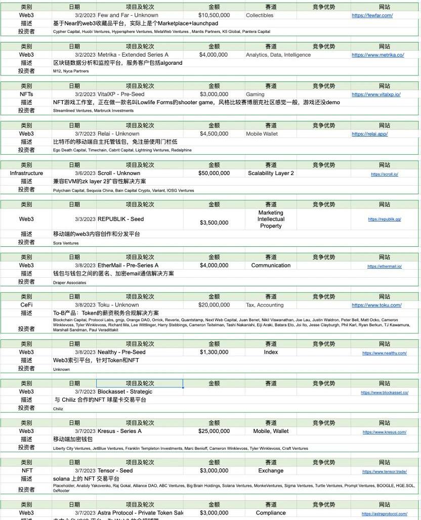 近两周可以看到Blur的热度已经维持在一个稳定的水平,占据的市场份额也保持在40%左右,本周NFT买方的数量明显回升,firsttimebuyer涨幅较大。蓝筹项目中,BAYC的地板价七日下跌5.69%,MAYC下跌4.52%。6.项目最新融资情况