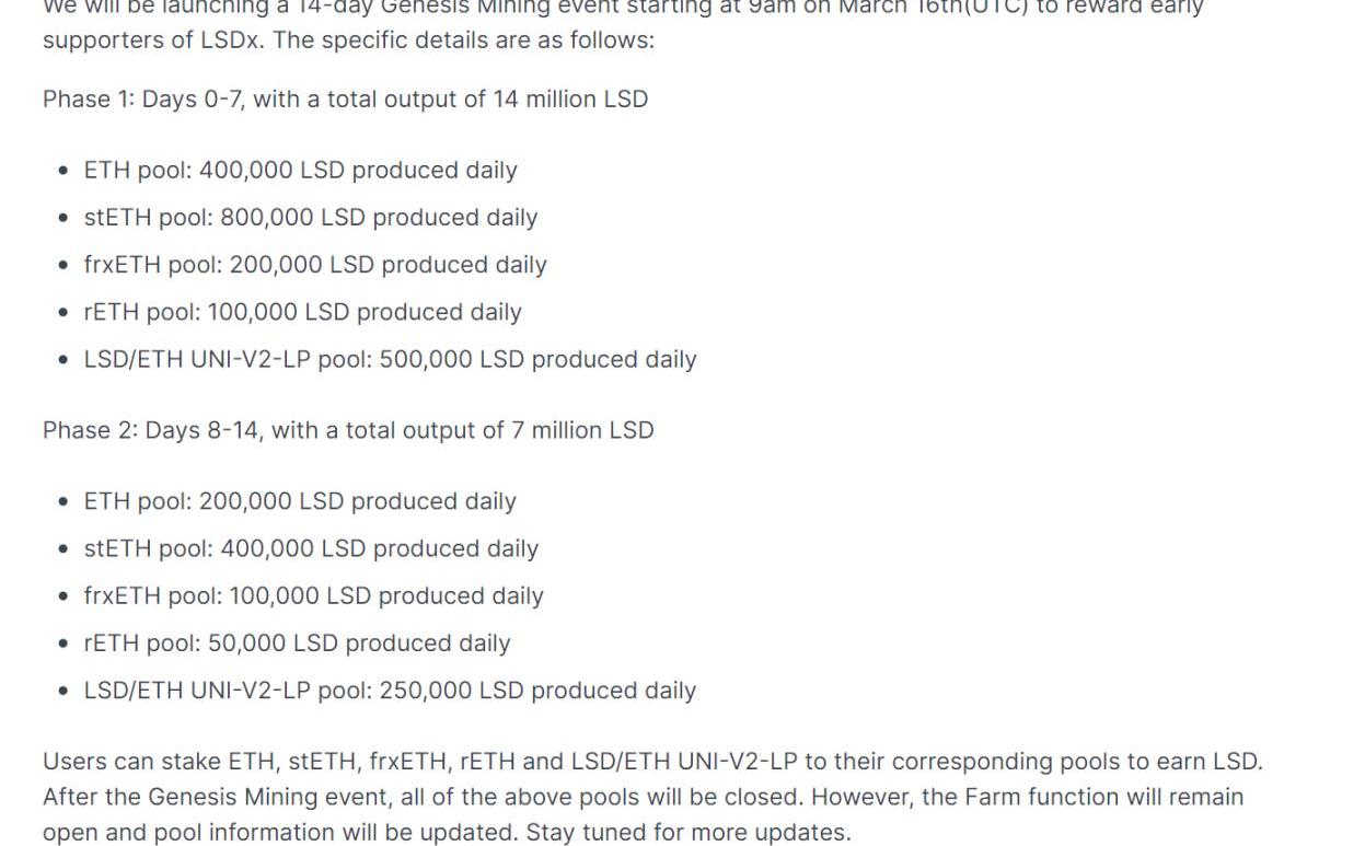 48小时锁定量5.5万枚ETH,2天增加了8000关注,代币上了Bitget、MEXC,今天公布由ForesightVentures投资,可以看出团队的充足准备。MarketCap:221万美元TVL:1.34亿美元目前支持的LSD数量也比较少,且功能未全部开发完成,还有很大期待空间,请注意16日之后的14天将是创世挖矿阶段,奖励将于4天后第一次减半: