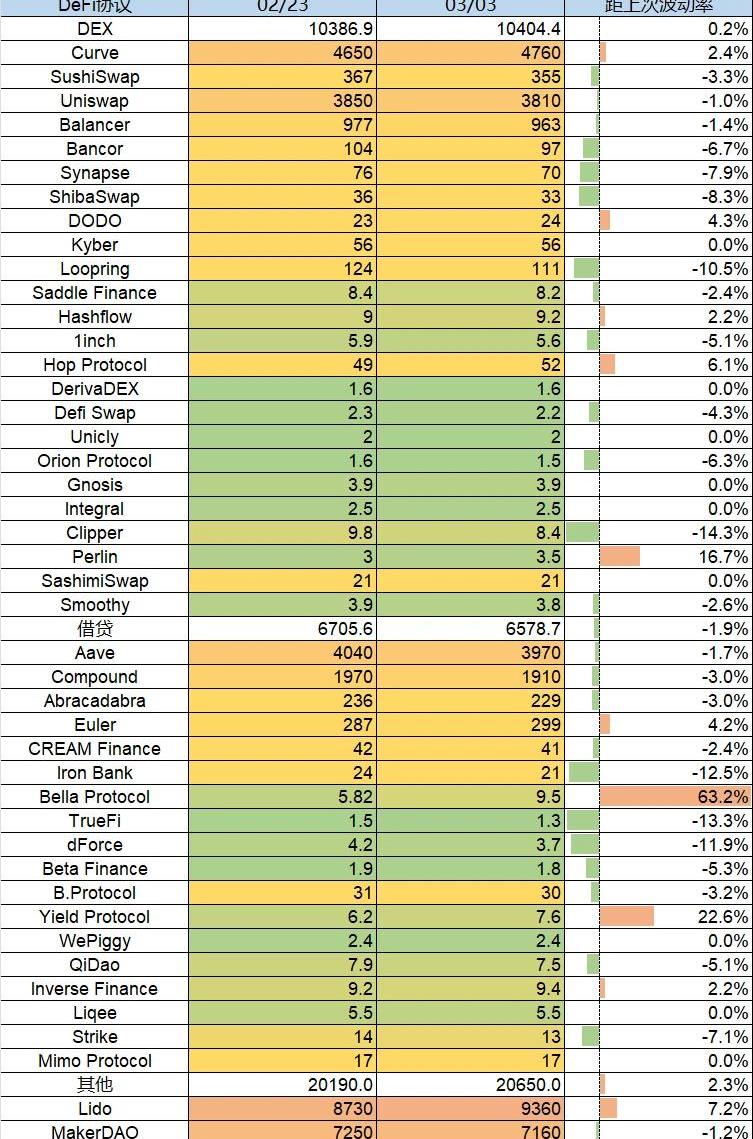 本周TVL较上周变化不大,略微下降0.11b,在layer2公链中,arbitrum持续上升3.8%,TVL上升至1.97b;optimism的涨幅最大,TVL达到了1b,相比上周也有10.76%的上涨。Avalanche的7日跌幅达到了6.81%3.各链协议锁仓量情况