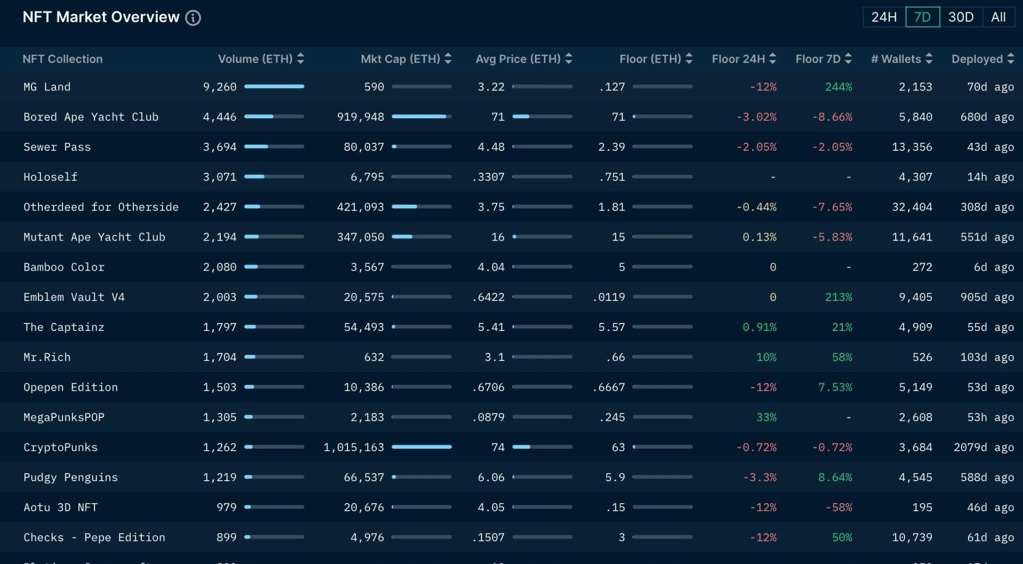 当前链上转账费用约为$0.9,Uniswap交易费用约为$8.19,Opensea的交易费用约为$3,42,本周Gas大幅下降,市场活性持续震荡;其中blur的活跃程度继续保持上周的趋势,gas消耗已经来到第一位,超越了uniswaprouter。5.NFT市场数据变化