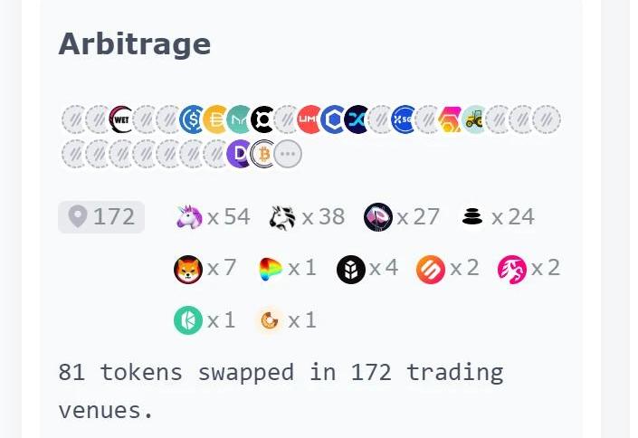 图:三边套利流程示意图以此类推,在实际的套利交易中,搜索者还可以从多个资金池中利用多个代币对的价差实现低买高卖的套利。目前,通过智能合约,MEV机器人甚至可以瞬时间内,从上百个资金池中完成上百个代币对的兑换。例如,下面这个套利交易中,MEV机器人就在172个资金池中完成了代币对兑换,共涉及81种代币。