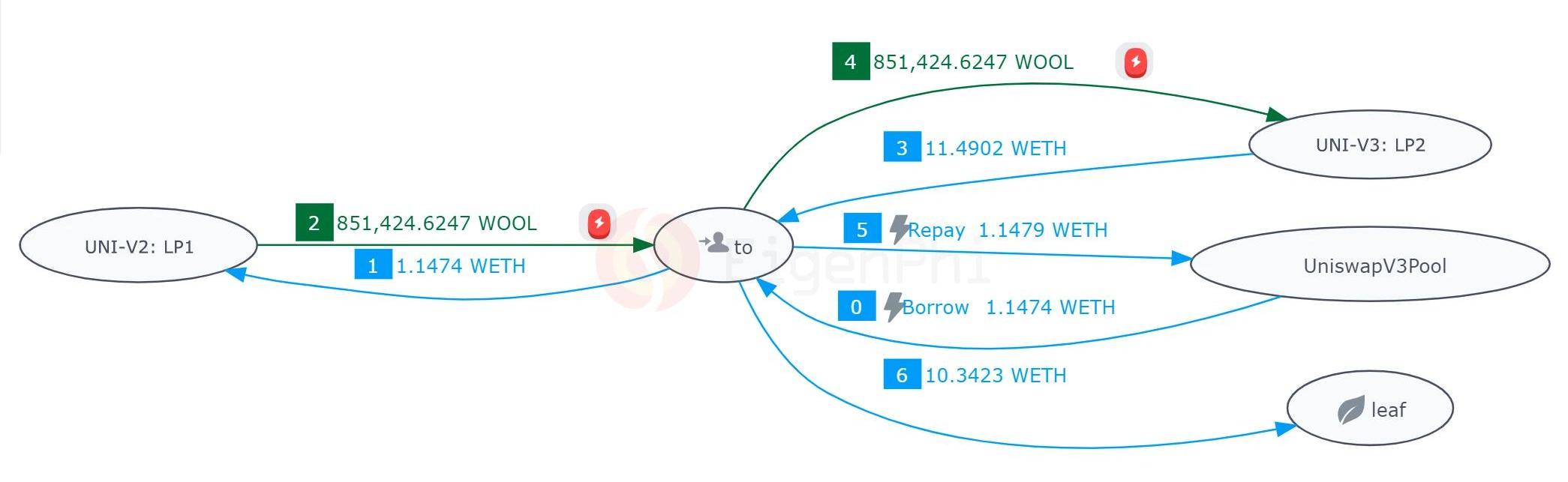 图上共五个交易节点:两个WOOL/WETH代币对流动性池,to地址,闪电贷借贷协议,以及搜索者的钱包地址。该笔交易整体的套利逻辑是:搜索者发现在两个流动性池中,WOOL/WETH代币对的兑换价格存在差价,具有套利空间。搜索者先是在LP1中用1.1474WETH兑换了851,424WOOL,并将换到的851,424WOOL在LP2中换回了11.4902WETH。该笔套利的收入等于步骤3获得的11.4902WETH减去步骤1付出的1.1474WETH,即约10.34WETH。而在上述套利的过程中,步骤1的“启动资金”,即1.1474WETH,是从UniswapV3借得的闪电贷。待到完成套利,搜索者偿还了该笔闪电贷并支付了服务费,共归还平台1.1479WETH。最终,搜索者从这笔交易中获得的利润等于其收入减去闪电贷服务费与gas费用。需要注意的是,虽然上述图将整个交易拆分为了几个步骤,但在智能合约中上述步骤都是同时完成的。搜索者甚至不需要支付初始资本就能完成套利,因此这笔交易其实是零成本的“空手套白狼”。对于三明治攻击者来说,其闪电贷的使用逻辑也是类似的。搜索者可以使用闪电贷即时借出大额资金,在抢先交易阶段制造更大的滑点。等到受害者的交易被执行,搜索者只需要紧接着在尾随交易中偿还该笔闪电贷即可。由于三笔交易都是同时被验证并被记录上区块,闪电贷的借款-偿付同样能顺利完成。总结