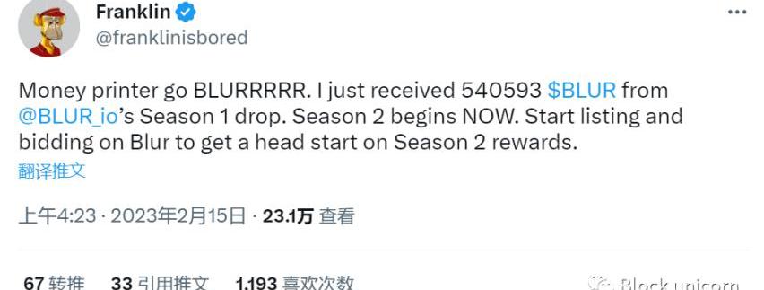Blur公司创新的空投设计拥有一些重要的经验1.顺序空投的市场增长Blur的创新之处在于采用了顺序空投模式,分阶段建立网络,并与新产品发布相匹配。这种有顺序的空投令牌有两个关键效果:分阶段建立网络,对应于市场上首先建立供应,然后是需求的方式。保持Blur用户的参与度,并让他们进入新推出的产品功能。2.不确定的奖励创造了更大的动力像大多数加密货币项目一样,Blur决定在推出之前保持空投的具体细节,但关键是,他们把细节抽象到游戏化和可量化的关爱包裹背后,在过渡时期为用户提供短期奖励。之后的每一次空投都是「比下一次更有价值」,创造了继续参与的动力,因为用户不知道他们将获得的真正名义价值。将这种方法与LooksRare最初的代币分配策略进行对比,后者的功能更像是DeFi流动性挖掘,奖励是特定市场活动的功能。LooksRare根据交易量对交易者进行奖励,这意味着交易者可以根据他们在某一天的交易量可靠地计算出他们将获得多少代币。这导致交易者为了获得LooksRare代币奖励而进行刷量交易,并导致几乎没有持续的有机活动。在比较人们为赢得某种奖励与不确定的奖励所付出的努力的研究中,研究人员发现,不确定性会产生更大的动力和努力。Blur的模型密切反映了作者NirEyal所提出的四步习惯养成过程:开始使用产品的触发点,满足触发点的行动,对行动的可变奖励,以及某种类型的投资,最终使产品对用户更有价值。另一个相关的策略是使用不同稀有程度的关爱包裹,以奖励忠诚度,并承诺为更稀有关爱包裹可以获得更多Blur代币。这使不确定性游戏化,创造了用户获得更稀有关爱包裹的动力。3.激励病式传播和社交分享为了从等待名单中脱颖而出并加入早期测试,用户需要尽可能多地赚取Blur积分。Blur将用户的病系数游戏化并给予奖励,推荐分享更多的用户获得更多积分。影响者在Twitter上发布信息,用户在群聊中分享推荐链接,Blur掀起了一股邀请热潮。重要的是,获得测试版的用户可以为第一个空投赚取积分,等待名单上的参与者和测试版用户可以从Blur获得一个额外的空投。