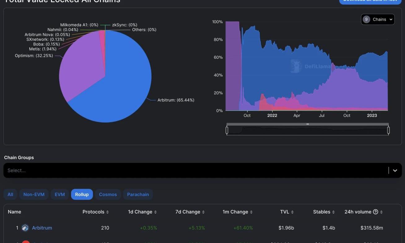 Layer2作为解决以太坊网络拥堵问题的核心解决方案之一,毋庸置疑是近几年的大热赛道。其中,Arbitrum又是Layer2赛道中的热门项目。根据DeFiLlama网站数据显示,目前Arbitrum的TVL已经将近20亿美金,位居L2赛道前列,其TVL占Rollup系的65.44%。和最直接的竞争对手Optimism相比,Arbitrum不仅TVL是Optimism的两倍多,其生态中的协议数量也是Optimism生态的两倍。