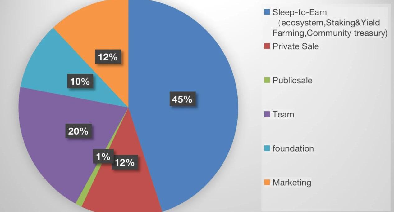 未来,项目方还将推出更多社交玩法,将睡眠健康和Social结合,用户可以邀请家人或朋友组成自己的睡眠社区,邀请好友和爱人来自己的NFT房间中共眠、社交类繁殖NFT等。GoSleep的代币经济模型