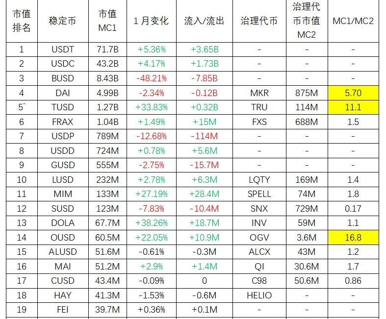 3.1竞争对手考虑到币安选择稳定币合作方,需要满足两个最基础的条件:1.项目运行安全稳定;2.已经形成一定的使用规模。因此根据DefiLlama数据,剔除脱锚的稳定币,整理了一份目前排名前列的稳定币数据见表2。从表格可以看出BUSD流出资金主要由USDT和USDC两者承接了,同时一些稳定币项目也在绝对值或相对值上获得一定增长,如TUSD、FRAX、USDD、LUSD、MIM、DOLA、OUSD。我们选择有治理代币的稳定币项目来进行深入研究,试着从中发现价值币。