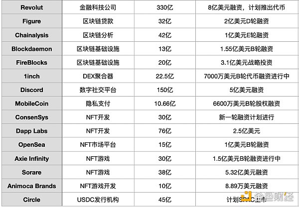 金色财经不完全整理,在超过30家的加密独角兽企业中,加密货币交易所占据了主要地位,包括印度加密货币交易所CoinSwitch Kuber、CoinDCX、韩国加密货币交易所Ubit、欧洲加密货币交易所Bitpanda。美国交易所Kraken等。此外,去中心化交易聚合器1inch也以22.5亿美元的估值上榜。