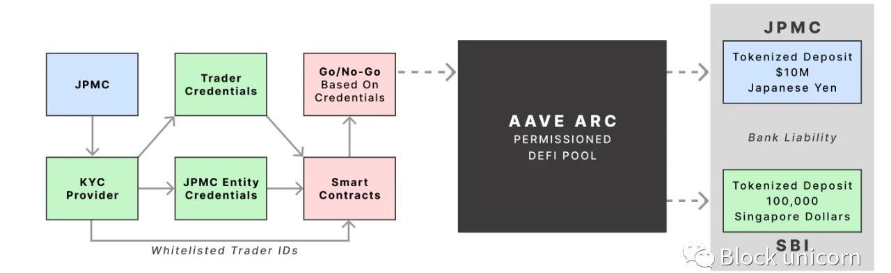为了使这个图表简单易懂,我省略了JPMC和SBI将他们的代币化存款发送到AaveArc协议中,而是显示了直接输入Aave协议的允许过程,以及每个交易对手所持有的银行负债。但是,让我们再次记住,Aave之前的一切都完全由Onyx管理,以支持合规性、银行标准和他们自己的内部要求,这意味着它实际上看起来是这样的: