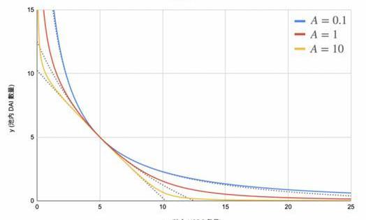 当k=0时,就是刚兑,曲率为零的情况,所有币都是恒价的,可以任意以1:x做交换,永远不会滑价。此模型称作恒定总量做市商(ConstantSumMarketMaker)。由于价格不会因供需而改变,因此当外部市场的稳定币间出现价差时,就会有人前来套利,直到其中一边的资金池枯竭为止,会使这些币种在池内失去流动性。当k=1时就是Uniswap的方案,此模型称作恒定乘积做市商(ConstantProductMarketMaker),遵循xy=k的反比例函数模型,然而交易深度较浅,价格将会明显改变。此模型函数曲率过大,价格变化太快,因此我们需要更平滑的曲线。Clipper的k取值介于0到1之间,这有点类似于curve,下图是curve的价格变化图。
