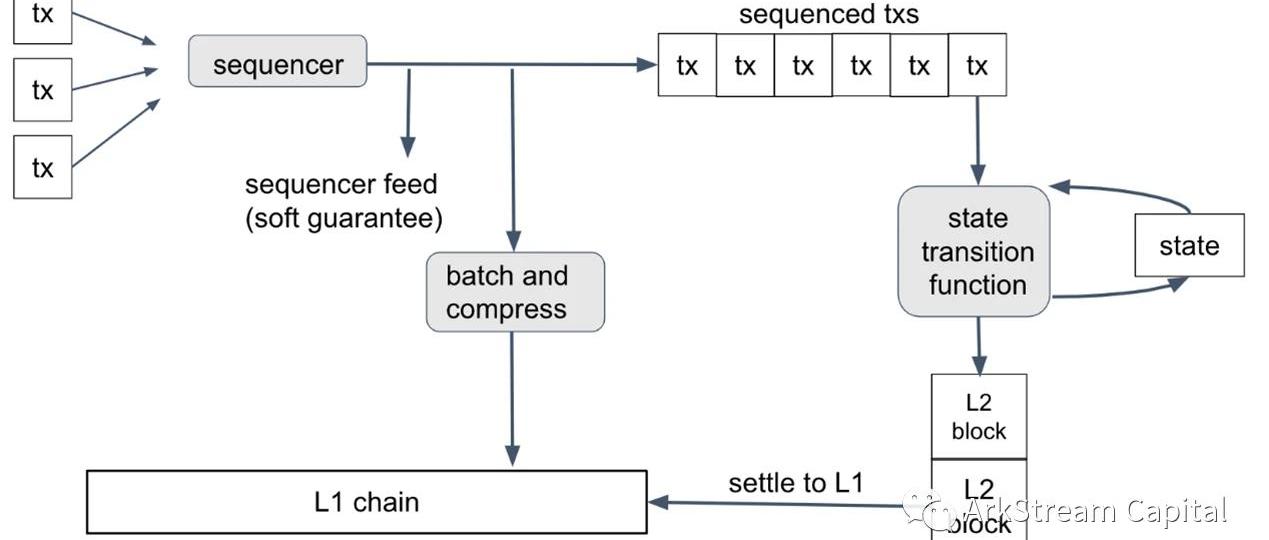 本质上,模块化区块链是通过聚合和组合的思想,重新定义和划分区块链的分层架构,并将其划分为不同的模块。这些模块互相独立,可以根据需求进行修改和扩展,并可以相互组合。这种组合而成的模块化区块链不仅可以提升各方面性能,还可以满足多样化的应用场景。过去,站在单体区块链的架构进行思考,我们习惯对其的拆分结果为:承载去中心化应用的应用层,负责执行去中心化应用智能合约逻辑的执行层,处理交易有效性、交易顺序和区块构成的共识层,维护、存储交易和区块的数据层以及进行点对点广播通信的网络层。对于模块化区块链的分层理解,极易以单体区块链的思维先入为主,由此会造成不少混淆。此时,可以从用户的视角通过正在运行的以太坊乐观Rollup的二层网络Arbitrum直观和深入的了解。通过Arbitrum白皮书关于二层网络交易流的阐述:可以知道,用户提交的交易不再直接与一层网络进行交互,转由二层网络的定序器进行收集和批量处理,定序器将批量处理的多笔交易原始数据压缩发送到一层网络,与此同时,也会对批量处理的交易进行排序,计算用户和网络状态转变,然后将状态结果发送到一层网络进行结算。