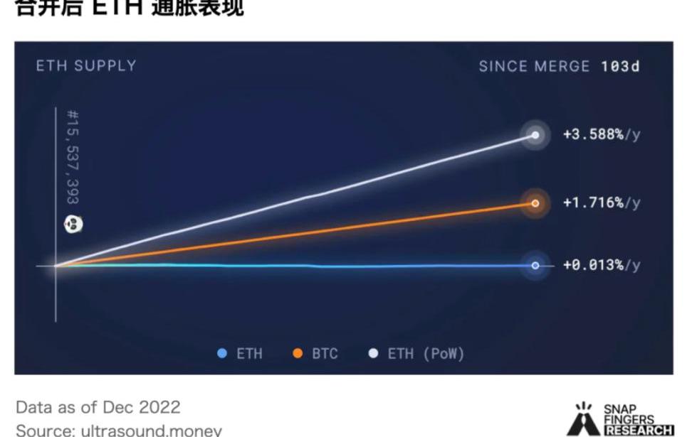 在过去的12个月中,以太坊的价格下跌了70%,从去年底约3700美元下跌至1,200美元左右。9月15日完成的Ethereum合并是一次历史性壮举,根据ultrasound.money数据显示,自合并以来,ETH的年通胀率已经达到0.013%,远低于PoW共识下的ETH以及BTC。