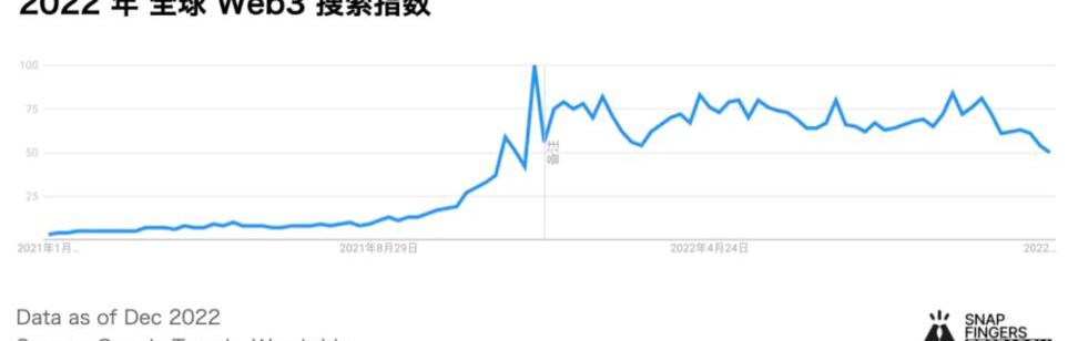 Crypto.com的年度文章中指出,尽管宏观环境充满挑战,但加密采用率仍保持强劲增长。截至2022年11月,全球加密货币所有者数量达到4.02亿,呈指数级增长。随着覆盖数十亿用户的传统品牌开始涉足加密领域,预计2023年加密货币持有者的数量仍将显着增加,包括:Facebook和Instagram开始测试NFT板块。星巴克开启NFT忠诚度计划。Telegram和Signal等加密通信平台在使用TON将加密功能集成到他们的平台中ElonMusk明确表示Twitter也将采用加密集成。全球Web3搜索指数在2021年底达到历史最高值100后,在2022年有所下降,但仍然保持了一定的关注度。