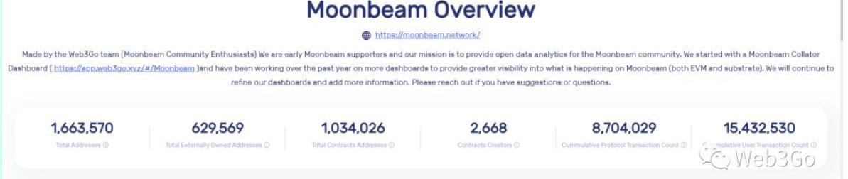 值此Moonbeam上线一周年之际,作为MoonbeamNetwork生态的早期支持者和建设者,Web3Go很荣幸地向Polkadot社区展示我们所开发的MoonbeamOverviewDashboard,作为生态内首家整合Substrate和EVM数据源的Dashboard,我们希望能通过数据层面向用户、生态支持者、开发者以及投资者们展示一个真实、生动的MoonbeamNetwork生态全貌。MoonbeamOverviewDashboard链接Dashboard结构总览