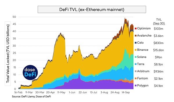 与过去几年不同的是,围绕这些竞争性链的讨论不再是一场关于每秒交易吞吐量的假想性争吵;相反,现在的焦点是这些竞争性链的 DeFi 市场份额。DeFi 行业已经日趋成熟,并且这些竞争性链之间有史以来第一次能够就 DeFi 市场份额进行正当合理的对话 (在这方面,TVL 是一个很好的指标,尽管该指标并不完美)。