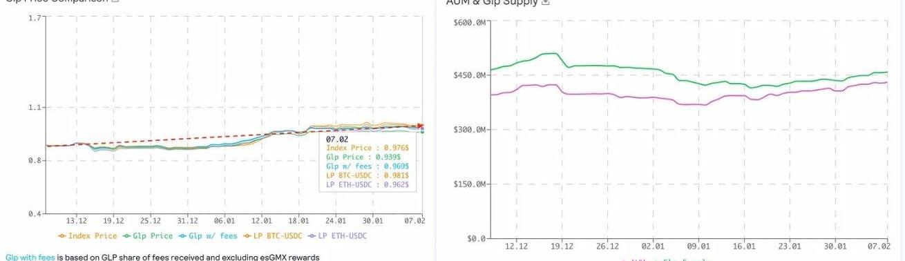 GLP的比较基准是50%USD+25%BTC+25%ETH的一揽子指数。在过去两个月的牛市中,由于多空比持续在3/1甚至4/1,GLP+费用分成的确是略跑输此指数,但如上述计算,其U本位价格依然是上涨的,既然U本位在上涨就不至于引起太大的恐慌了,所以GLP总量也未出现所谓的恐慌式下降。