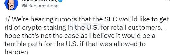 2月9日,疑受美国监管消息影响,加密货币市场短时急跌。BlockBeats汇总了目前市场上对于美国SEC监管的流言,目前尚未有政策落地,但我们仍然需要注意风险。今晨,Coinbase创始人BrianArmstrong发推表示,据传闻,美国证券交易委员会希望在美国封禁散户的加密货币质押。