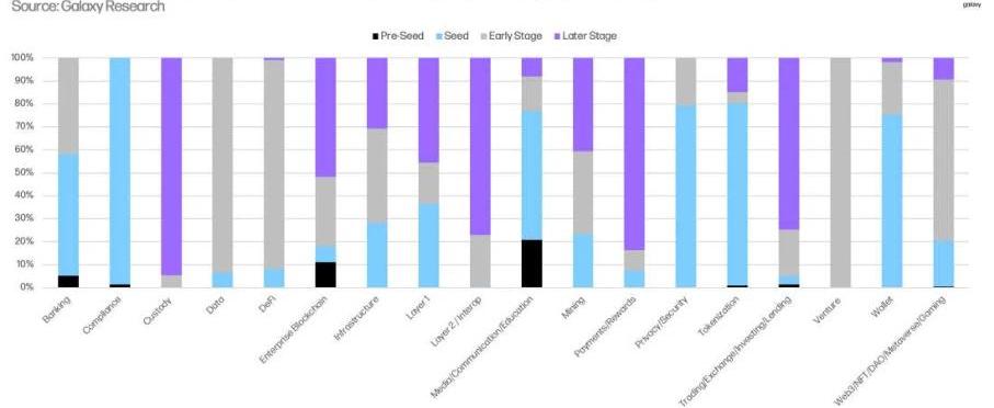 当我们按照行业类别和发展阶段来划分投资交易时可以发现,投资大多投向了处于早期发展阶段的Web3公司。在Web3、钱包、隐私/安全、合规和挖矿类别的投资中,有超过50%的交易都是发生在处于种子轮和种子前,在交易和数据类别的投资,有60%都发生在A轮及之后。
