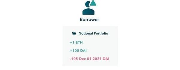 存款人通过购买折价的fCash由此锁定一个利率,fCash代表了他们可以在到期时有权获得相关基础货币的金额。借款人利用超额抵押铸造出fCash,并通过出售fCash以获得基础货币,同时换取在未来特定时间偿还的义务。固定利率存款:存款人向流动性池子里支付Dai,系统会自动将Dai存入的Compound中换取cDai,再到流动性池中购买折价的零息债券fDai。存款人在交易时付出的Dai与fDai在到期时可以获得其基础货币的差额,即为存款人获得的固定存款利息。在下面的例子中,存款人希望以一年的固定利率向Notional上的提供100个DAI贷款。存款人首先将他们的100DAI转换为cDAI,然后将cDAI存入Notional流动资金池,以换取105fDAI。当贷款在2021年12月1日到期时,存款人可以将他们的105fDAI赎回为cDAI,然后将cDai转换成105DAI。
