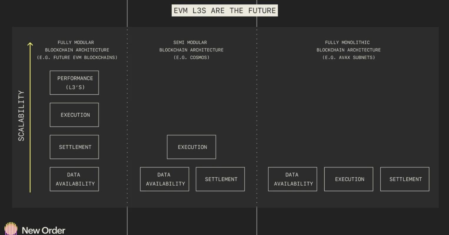 Layer2(L2)通过降低gas费用和增加吞吐量来提高以太坊的可扩展性。由于这些可扩展性因素,以及存在的权衡,L2必须选择针对特定项目进行优化。Layer3是基于L2构建的特定于应用的区块链,旨在减轻这些权衡并进行更多改进。它们类似于Cosmos、Avalanche和Polkadot等应用链环境,但受益于构建在模块化区块链协议栈而不是单体链协议栈上。因此,部署一个完全模块化的区块链基础设施堆栈,包括一个通用的L2以及可定制的L3,将标志着单体应用链生态系统时代的结束,以及去中心化应用开发新时代的开始。