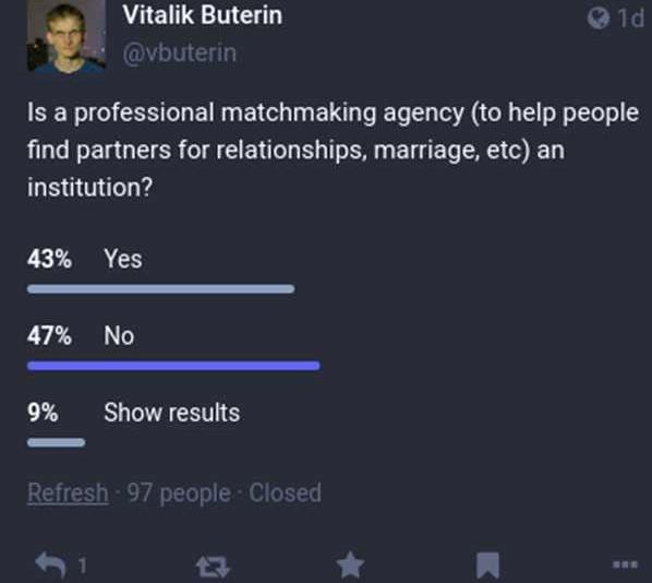 最令我惊讶的发现是,「独立于个体的角色」是迄今为止最弱的相关性。由民主国家运营的Twitter是最具制度性的,但通过付费治理计划运营的Twitter与由Elon直接运营的Twitter一样是制度性的。独立于个人的角色增加了稳定性的保证,但以错误的方式独立于个人的角色让人感觉太陌生、随意,或者不像制度。约会网站比专业的婚介机构更独立于个人,但人们认为婚介机构更像机构。尝试高度角色驱动和机械可信中立的媒体,只是感到陌生-也许是坏的,但也可能是好的,如果你发现今天的制度令人沮丧,你对可能的替代方案持开放态度。「大众认可精英」和「精英监督专家」相关性高。第二个比第一个高,尽管Hanson和我可能对「recognize」有不同的理解。「意向结构」图表的右下角是空的,但左上角是完整的,这表明意向结构是必要的,但不足以使某物成为制度。也就是说,我的主要结论可能是「institution」一词一团糟。与「institution」一词所指的是一系列概念不同,该词似乎有许多不同的定义:1.这种结构符合我们熟悉的「大众认可精英,监督专家」的模式2.任何有意设计的用于调节人际互动的大型结构(包括金融市场、社交媒体平台和约会网站等)3.广泛流传和普遍规范的社会习俗我怀疑反制度主义者将他们的怀疑集中在(1)上,特别是(1)的例子被错误的部落抓住了。对于反制度主义者来说,结构是个人主义的还是角色驱动的似乎并不重要:个性和官僚机构同样可能来自错误的部落。反制度主义者一般不反对,实际上在许多情况下希望(3)尽可能地取代(1)。对(2)的支持可能与Pourteaux的「技术乐观主义者」与「技术极简主义者」的区别密切相关。技术极简主义者不认为Twitter、Substack、比特币、以太坊等是解决方案的一部分,尽管有些「比特币极简主义者」将比特币区块链视为一个狭隘的例外,否则他们希望看到一个由家庭等因素决定更多结果的世界。「技术乐观主义反制度主义者」专门参与了一项计划,要么试图用正确的(2)取代(1),要么试图通过引入更多正确的(2)元素来改革(1)。反制度主义者或制度改革者的前进方向是什么?