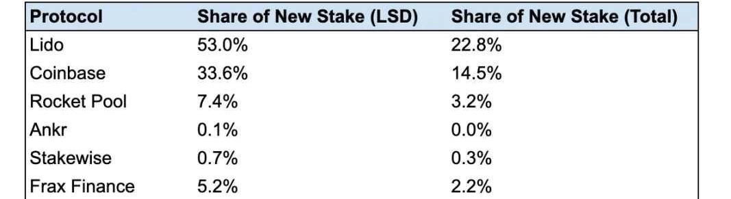 资料来源:DuneAnalytics尽管增长总量最大,但Lido在主要LSD发行商中的增长率「仅」排名第三。在此期间,stETH发行商的市场份额也有所缩小,流动性下降3.4%,整体下降1.0%。Lido的增长率较慢是可以预期的,因为与较大的协议相比,一个较小的协议更容易以更快的速度增长。然而,在查看合并后谁在吸引新质押的ETH存款时,我们可以看到有迹象表明该协议对流动性质押的控制可能开始松动。