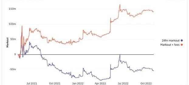 图一衡量UniV3上ETH/USDC池子的每笔交易的“边界”,即使用未来价格的交易的未实现账面损益额。例如,5分钟标记=交易发生5分钟后未实现的盈亏。这是我之前工作的HFT高频做市商在传统金融中常用的一种度量方法。它衡量多个时间范围内执行交易的性价比。“边界”预示着我们实现的盈亏,要想准确找到每个LP和交易方式会很繁琐。5分钟后LP未实现盈亏:-2100万美元1小时后LP未实现盈亏:5600万美元1天后LP未实现盈亏:-9700万美元7天后LP未实现盈亏:-9200万美元