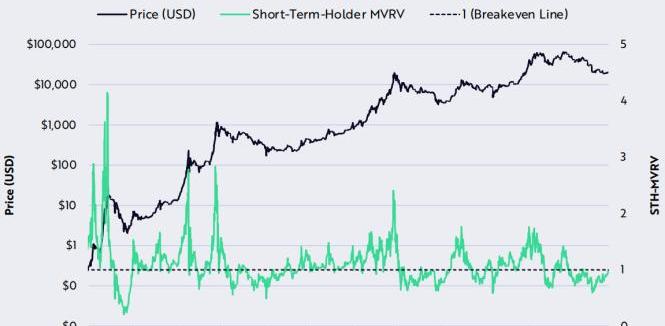 长期持币者支出产出利润率ARK观点:看涨长期持币者的交易亏损似乎与2015-2016年和2018-2019年熊市期间的亏损比例相当,表明存在投降式抛售。LTH-SOPR是长期市场参与者所持币的售出总价与买入总价之比,目前的数值为0.5。这表示平均而言,长期持币者蒙受了近50%的损失,这显然表明,即使最有耐心的参与者也遭遇了亏损。该指标重回或高于1将表明长期持有者开始获利,这标志着新一轮看涨趋势的开始。短期持币者盈亏平衡,迎来阻力位