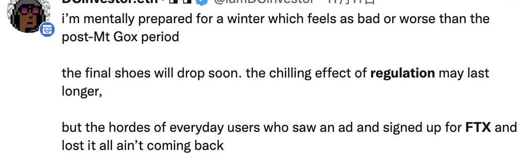 加密大VDCinvestor.eth:我已经做好了迎接冬天的心理准备,这个冬天的感觉和MtGox后时期一样糟糕或更糟。最后的鞋子很快就会落地。监管的寒蝉效应可能会持续更长时间,但是那些看到广告并注册FTX并最后失去一切的日常用户群不会回来了。