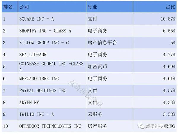 ARK金融科技创新基金的投资组合前十大持仓股票来看,持股公司涉及支付、电子商务、房产信息服务、加密货币和云服务等领域,前十大持仓股票分别为Square、Shopify、Zillow、Sea Ltd、Coinbase、Mercadolibre、Paypal、Adyen、Twilio、OPENDOOR TECHNOLOGIES,前十大持仓股票占比达到51.87%,超过一半。前十大重仓股中,电子商务公司有三家,分别是SHOPIFY INC、SEA LTD、MERCADOLIBRE INC,还有两家是房产服务平台,Zillow Group和OPENDOOR TECHNOLOGIES,另外有一家是云服务平台TWILIO。因此前十大重仓股中,严格意义上的金融科技公司只有4家,其中3家是支付公司,另外1家则是加密货币交易所公司,其余6家并非严格意义上的金融科技公司。