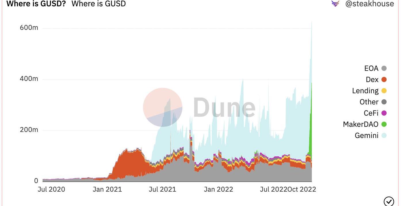 此举能够让MakerDAO有更多机会获得资金,且与之前相比,并不会增加额外的信用风险和托管风险。加密创业者EricKryski在MakerDAO论坛中表示,从监管机构和大多数律师、学者的角度来看,Paxos和Gemini的稳定币的存款信托结构比Circle更好。存款信托是受监管的金融机构,在结构和监管要求上更接近银行和信用合作社。和Circle的货币传输器相比,GUSD更类似于存款收据。倘若金融机构破产,两者的索赔权不同。这一做法已经如愿使Gemini的GUSD的市场份额显著提升。如上图所示,10月份,PSM中的GUSD余额平均约2.83亿,已经达到Gemini的奖励标准。根据CoinGecko的数据,截至11月3日,GUSD的流通量创下历史新高,为6.25亿,与9月29日的3.11亿相比增长了101%。从Etherscan上可知,目前存在于Maker:GUSDPSM中的GUSD为3.03亿,占GUSD总量的47.3%,甚至超过了Gemini中的数量。DuneAnalytics上的图表也显示,近期GUSD的总量和MakerDAO中的GUSD数量急剧上升,而DEX中的数量减少。