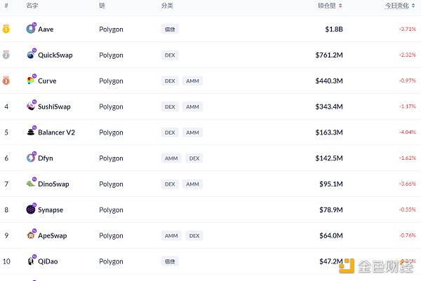 Polygon链上DeFi锁定资产前十排名及锁仓量,数据来源:Debank