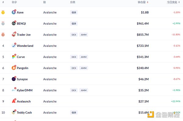 Avalanche链上DeFi锁定资产前十排名及锁仓量,数据来源:Debank