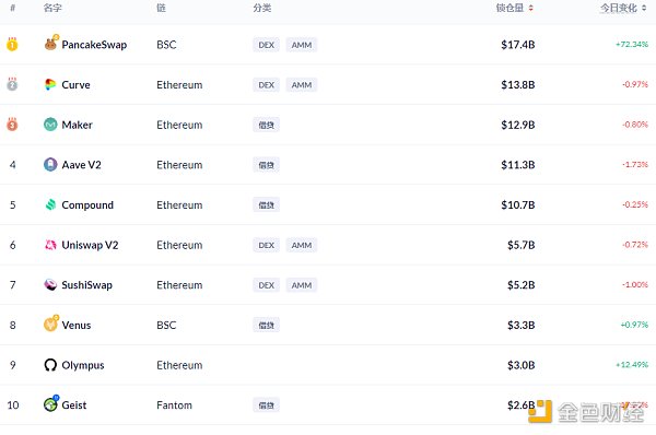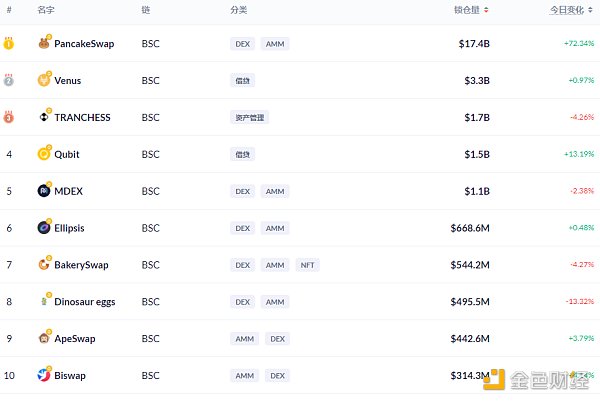 BSC链上DeFi锁定资产前十排名及锁仓量,数据来源:Debank
