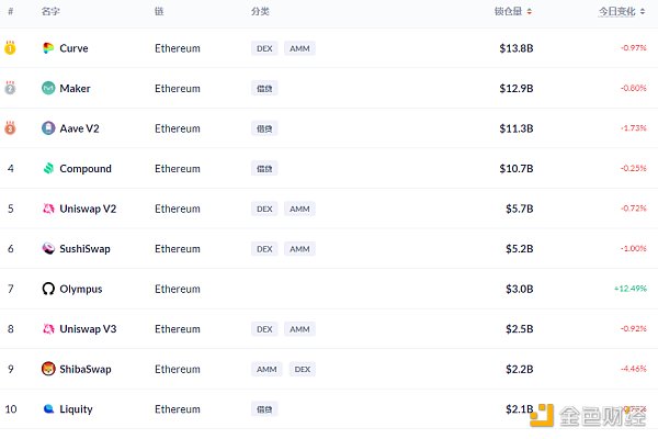 Ethereum链上DeFi锁定资产前十排名及锁仓量,数据来源:Debank