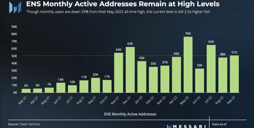 在用户体验方面,ENS为整个Web3领域迈出了重要的一步。ENS提供了一个用户友好的解决方案,将区块链地址映射到易于复制的域名。任何人都可以注册并拥有多年的ENS域名。ENS域名注册数量在22年第三季度创下历史新高。同时,续订量环比增长了3倍。鉴于许多ENS名称将在未来几个月内续订,注册和续订是否会继续增长还有待观察。尽管市场疲软,ENS月度活跃地址依然强劲。虽然较2022年5月的峰值下降了33%,但月活跃地址仍同比增长2.5倍。这表明ENS正在以加速的速度被广泛使用。虽然是一个无可争议的独特而可靠的项目,但对ENS的真正考验是围绕可靠的用例建立一个可持续的用户基础。原地址